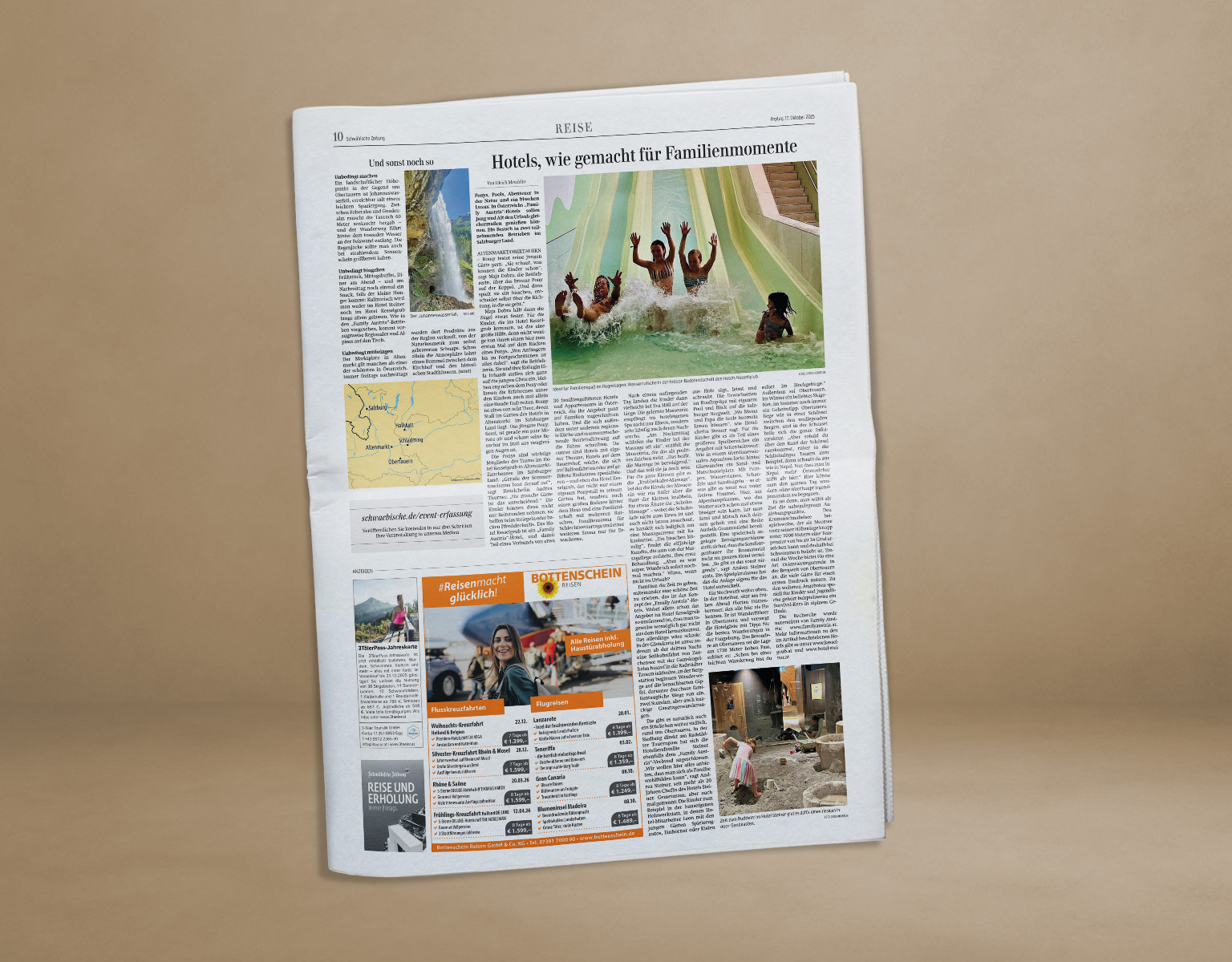 Den Alltag hinter sich lassen, entspannen, Neues entdecken: Die jeden Freitag erscheinenden Sonderseiten „Reise & Erholung“ in der Schwäbischen Zeitung bieten wertvolle Anregungen für Kurztrips, Urlaubsreisen und Auszeiten in der Region und weltweit. Ob Genussreisen, Wandertouren, Städtetrips oder Wellnessangebote – die Rubrik spricht erlebnisfreudige und reiselustige Leserinnen und Leser an, die Wert auf Qualität, Komfort und Inspiration legen.