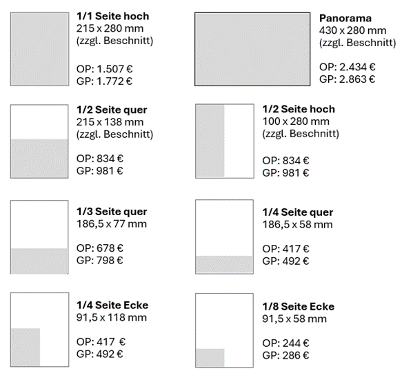 Anzeigen mit Beschnitt (1/1-seitige und 1/2-seitige Anzeigen sowie Panoramaseiten) sind grundsätzlich ohne Rahmen zu setzen.