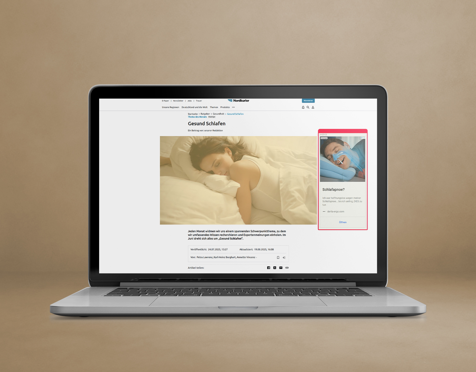 Das Thema des Monats ist ein aufmerksamkeitsstarkes Digitalformat von nordkurier.de, das Werbekunden eine prominente Platzierung innerhalb der redaktionellen Schwerpunktinhalte zu Gesundheit ermöglicht. Ihre Bannerwerbung erscheint kontextuell eingebettet in thematisch passenden Artikeln – von „Gesund schlafen“ bis „Atmen & Lunge“. So erreichen Sie Ihre Zielgruppe punktgenau in einem glaubwürdigen redaktionellen Umfeld.